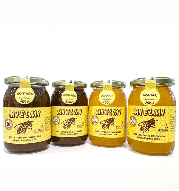 - Contenido del pack: 2 botes de miel cruda de montaña (500 g cada uno) y 2 botes de miel cruda de azahar (500 g cada uno).