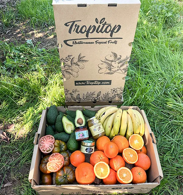 - Inhalt der Box: 2 kg Hass-Avocados, 2 kg Orangen, 1 kg RAF-Tomaten, 1 kg Bananen, 1 Glas Orangenblütenhonig (500 g), Guaven- und Mangomarmelade.