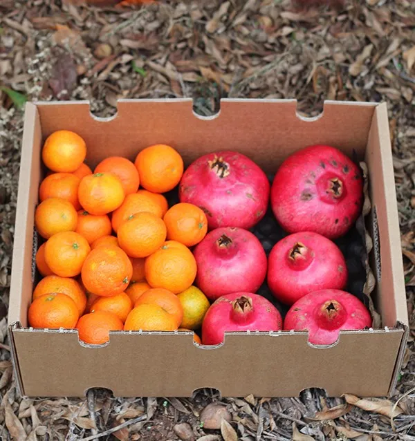 - Der Kiste enthält 2 kg Granatäpfel und 2 kg Mandarinen aus nachhaltigem Anbau, etwa 35 bis 40 Stück.