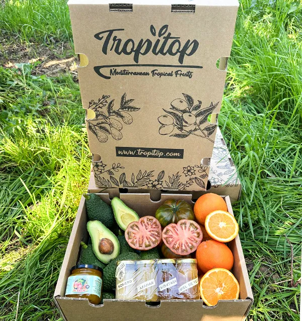 - Contenido de la caja: 2 kg de aguacate hass, 2 kg de naranjas, 1 kg de tomate raf, pack de 4 mieles pequeñas (320 g en total: romero, montaña, azahar y flores) y 1 mermelada de mango (elaborada con nuestra fruta).