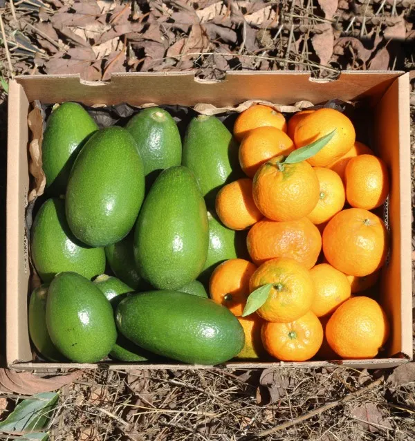 - Contenu de la boîte : la boîte de 4 kg comprend 2 kg d’avocats à peau lisse et 2 kg de mandarines. La boîte de 9 kg comprend 4,5 kg de chaque fruit.