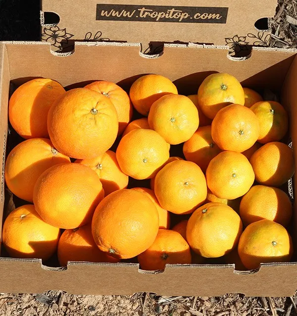 • Variété d’orange : la variété d’oranges que nous expédions dépendra du moment de la saison et de celle qui est récoltée à ce moment-là. De taille moyenne et de forme arrondie. Saveur douce, sucrée et équilibrée.